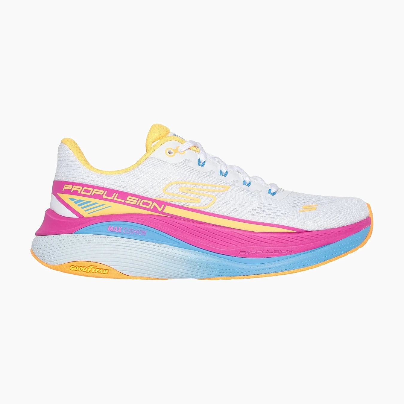 Mejora tu rendimiento con la máxima comodidad con Skechers Max Cushioning® Propulsion. Este modelo vegano para correr, confeccionado con materiales reciclados, presenta una parte superior de malla diseñada con una plantilla Skechers Air-Cooled Goga Mat™, una entresuela Max Cushioning® excepcionalmente cómoda y una suela exterior de caucho Goodyear® antideslizante. Our Planet Matters®: bueno para tus pies. Bueno para el mundo.®