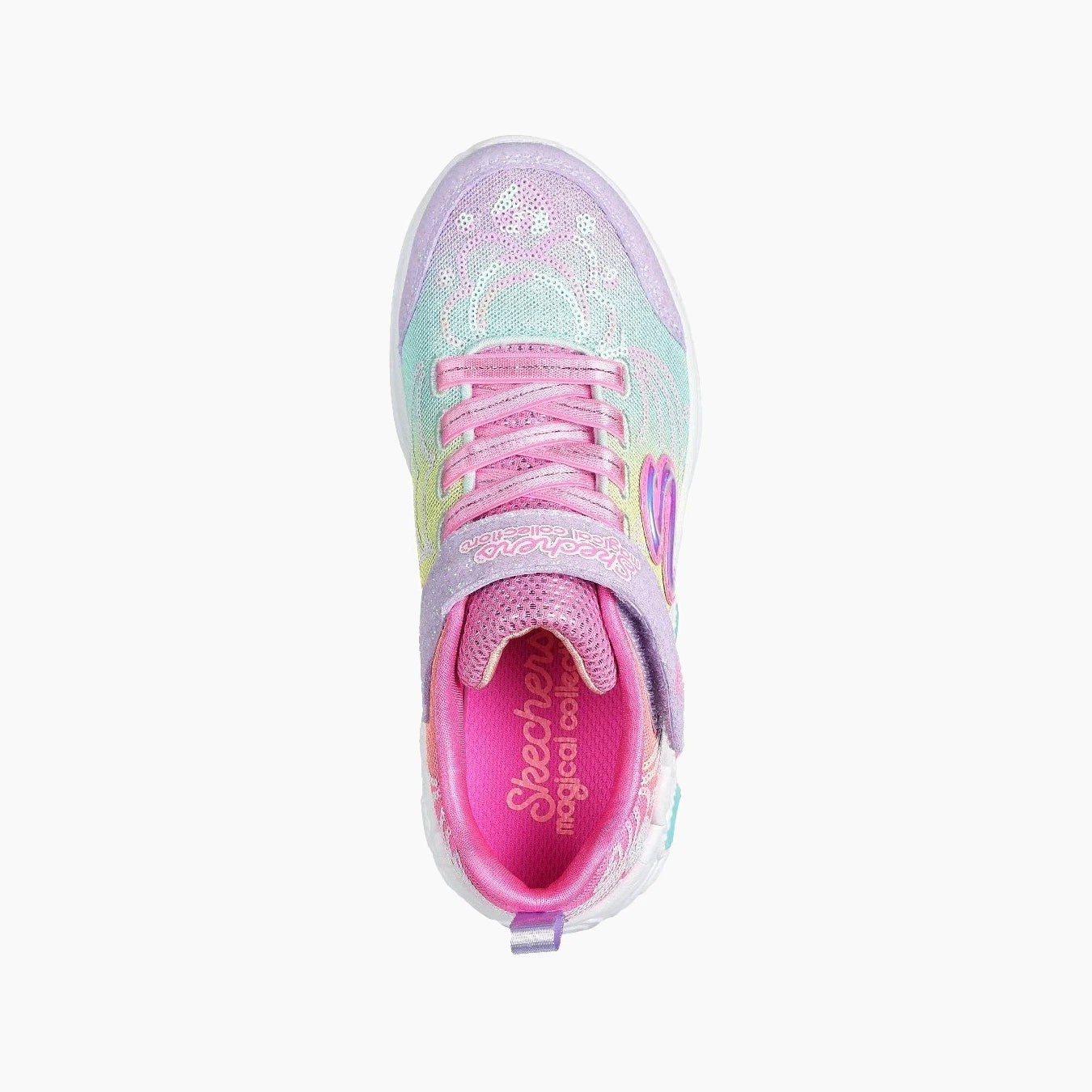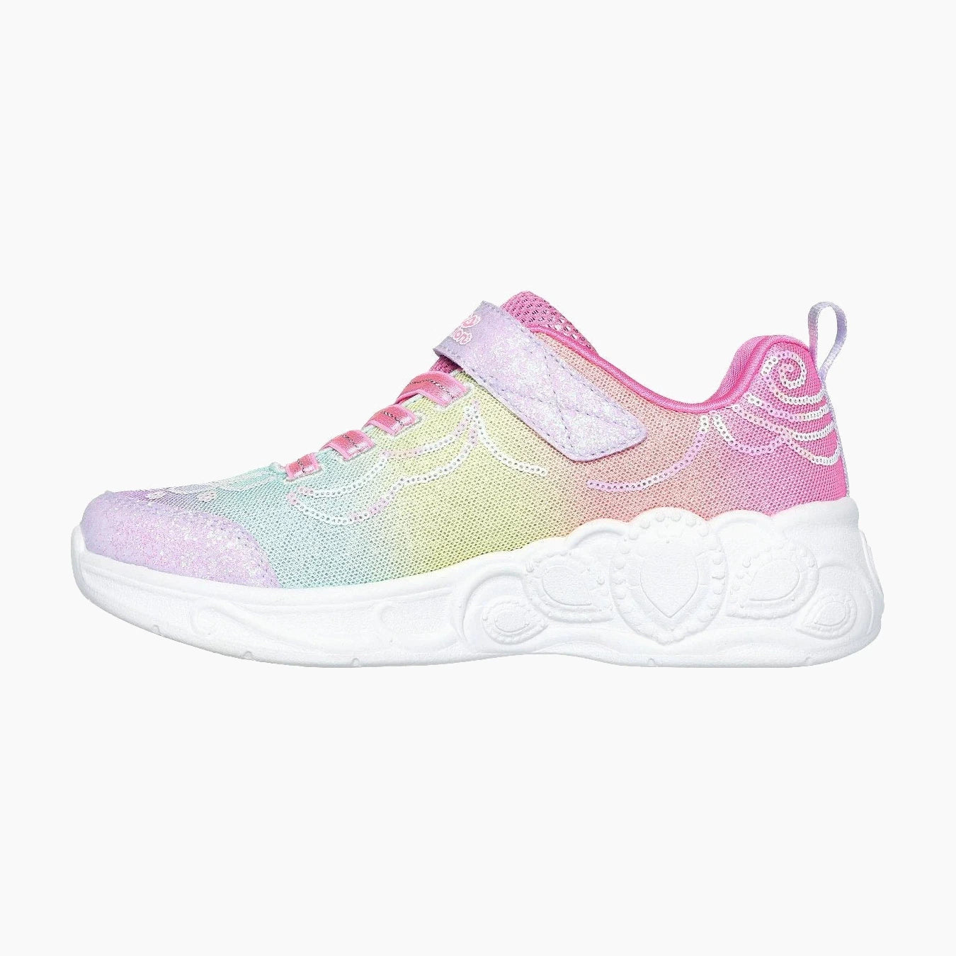 Ilumina tus pasos con un estilo realmente lindo en Skechers S-Lights®: Princess Wishes. Este diseño deportivo con temática de Magical Collection® presenta una parte superior adornada con malla brillante y lentejuelas con cordones elásticos, correa ajustable en el empeine, plantilla cómoda acolchada y entresuela iluminada. Varita adicional incluida como regalo con la compra.